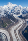 Pictured: Tokositna Glacier, Alaska Range, Alaska – a fine set of medial moraines on Tokositna Glacier, descending from Denali, the highest mountain in North America. Debris from rockfall is sourced along the valley sides where, where two tributary glaciers combine, forms a medial moraine. Glacier flow transfers a large amount of debris towards the snout. Multiple moraines are the result of several tributaries joining the main glacier.